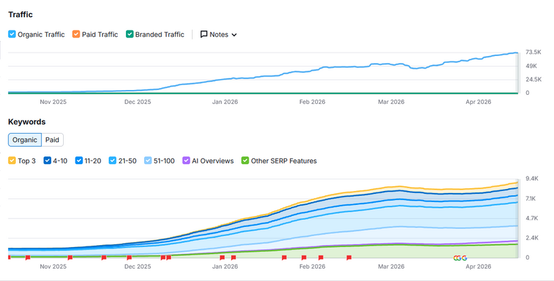 We have only been working on the Feather Flags Express website for about 14 months now but it is already quite successful and Josh is happy with the amount of orders he is receiving. Again we have focussed on content marketing and are creating 1 or 2 blog posts per month which we then share on social media which are generally well received and get quite a few up votes and likes. This one has also really started to perform in the past 6 months and is getting 73.1k hits a month from organic as you can see here: