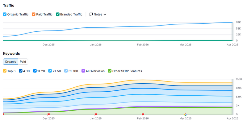 We have been working on the UK Feather Flags website for about 11 years now and it has always ranked well for it’s keywords – Usually in the top 3 on Google for its main keyword feather flags. Josh knows what he is doing with on page SEO so we have mainly been helping him with content marketing by creating awesome blog posts about flags with infographics, guides, collections and more that we share on social media. The website has always done OK on organic traffic but in the last 6 months it has really started to take off and it is now getting over 2,000 hits a day from search as you can see in this screenshot from Semrush with the traffic and keywords: